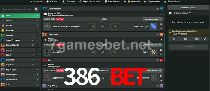 O 386 Bet oferece uma grande seleção de opções de apostas em e-sports com probabilidades competitivas